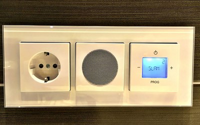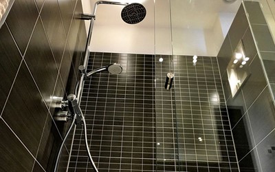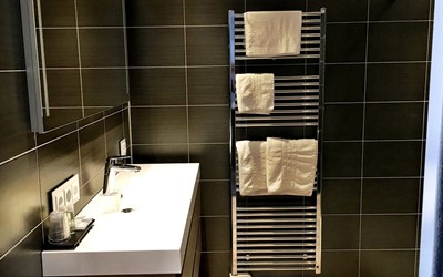 - Een royale doucheruimte met stort- en handdouche, spiegel met spiegelverwarming, handdoekradiator, föhn, radio en vloerverwarming.