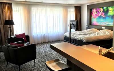 Onze mooie en moderne "Deluxe Room" van ca. 45 m2 ligt op de 2e verdieping en is bereikbaar via de trap en een lift.