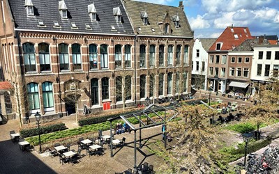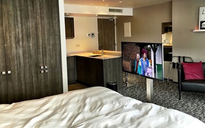 - Een kamer met pantry met uitzicht op de Zwolse Peperbus voorzien van een 2-persoons bed met heerlijke boxspring matrassen, zitje, HD-TV, sfeerverlichting, airconditioning, voldoende kastruimte met hotelkluis.